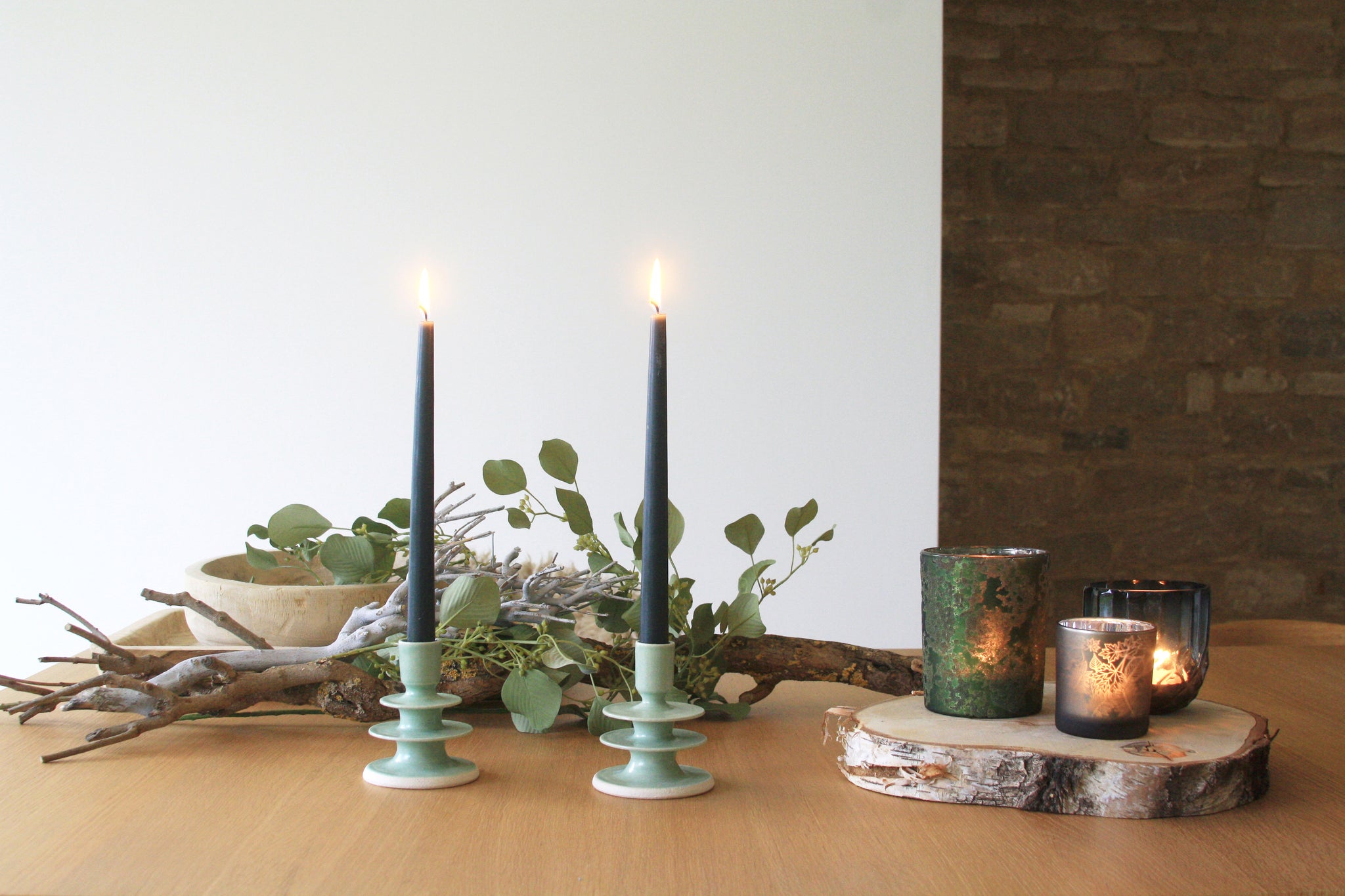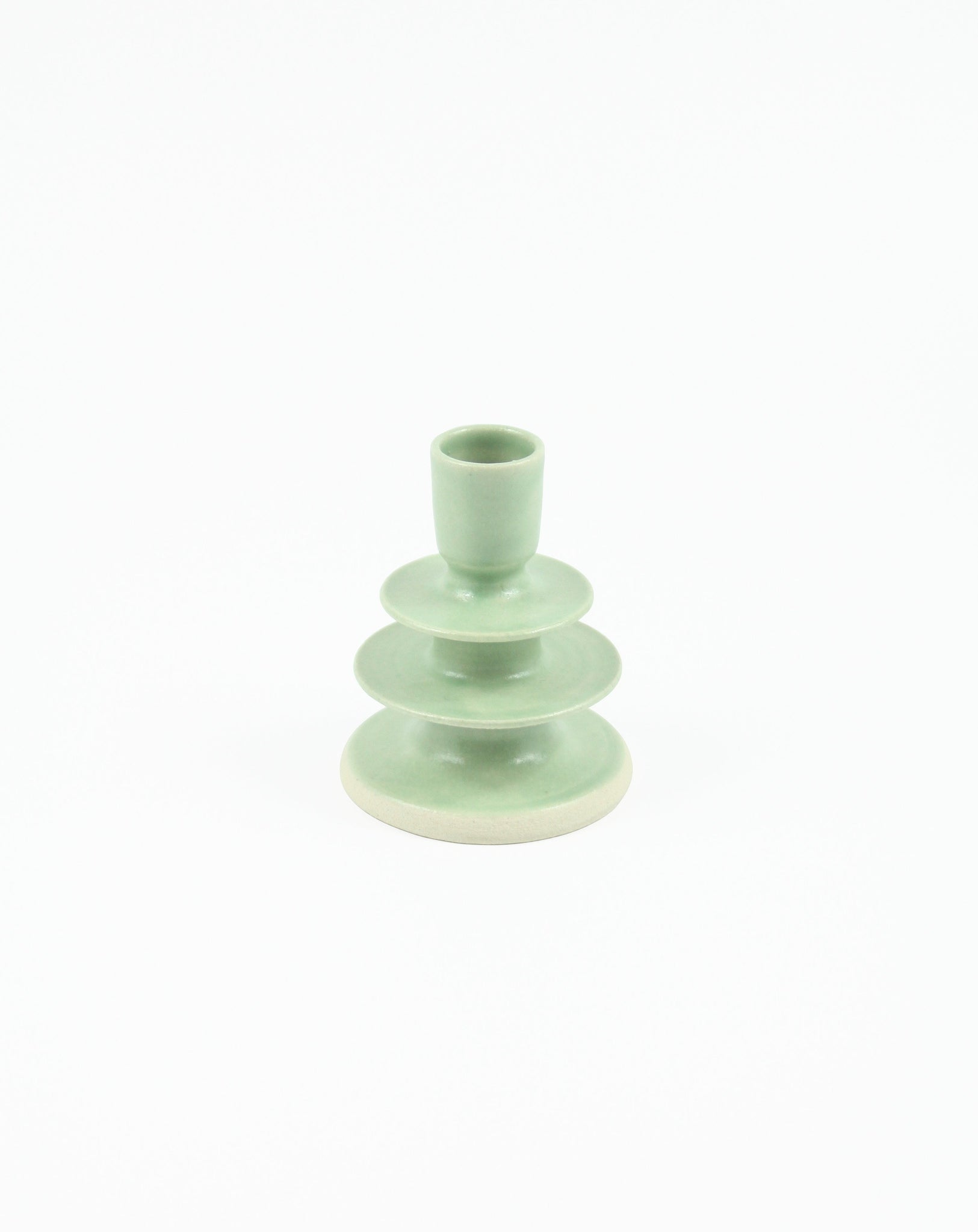 Arriving in a subtle green, this Tiered Candlestick Holder is both elegant and sculptural. This item is attractive to complete any table setting or shelving display.